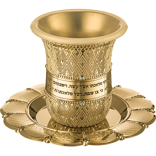 גביע קידוש גימור זהב פיליגרין עם ברכה "ויכלו.." עם תחתית 15 ס"מ – תכולה 100 מ"ל