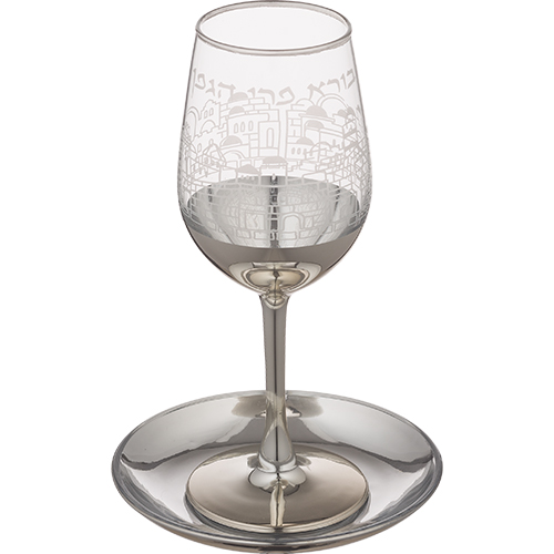 גביע קידוש זכוכית שקוף וכסף "ירושלים" 21 ס"מ