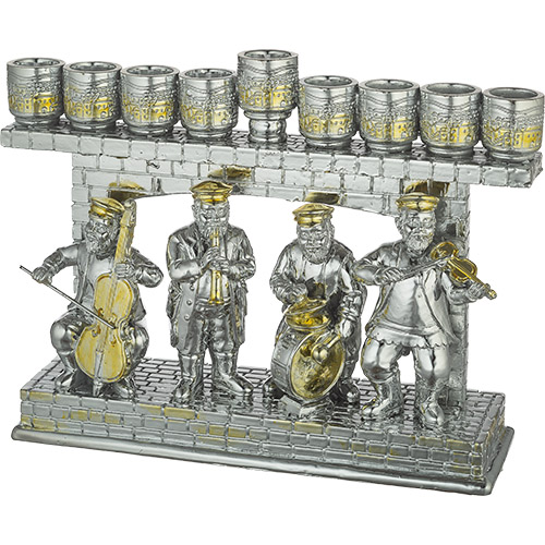 חנוכייה מהודרת מפוליריזן מוכסף עם חסידים מנגנים 22X16 ס"מ