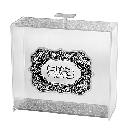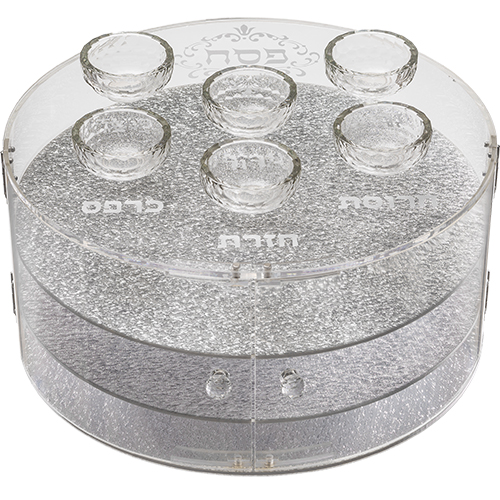 כלי למצה מאקריליק שקוף עם נצנצים כסף ופלקטה 21×23 ס