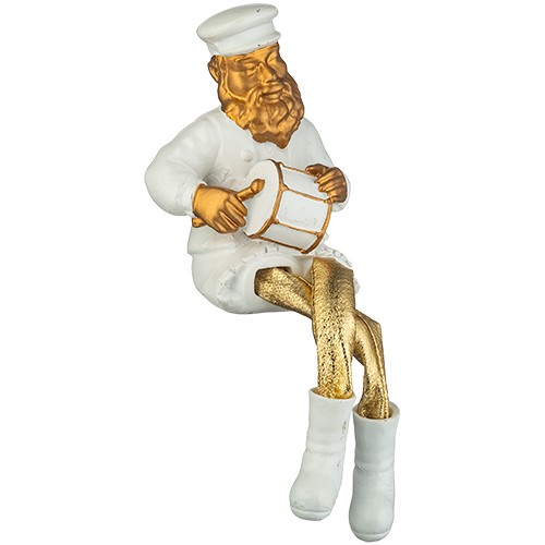חסיד יושב מפולירייזן לבן עם רגלי בד זהב 25 ס"מ מנגן בתוף