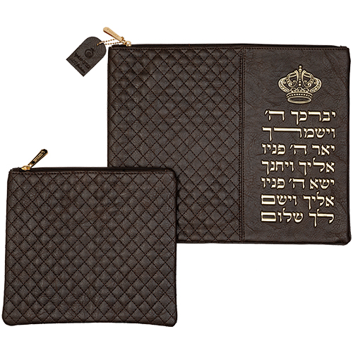 סט טלית תפילין דמוי עור חום כהה אותיות בולטות "יברכך" 29X36 ס"מ