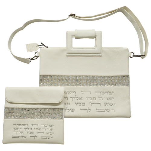 תיק מפואר לטלית דמוי עור לבן אותיות בולטות "ויברכך" 38×31 ס"מ