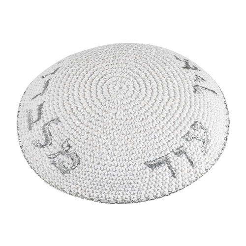 כיפה סרוגה 16 ס"מ לבנה עם ריקמה "האש שלי" כסף