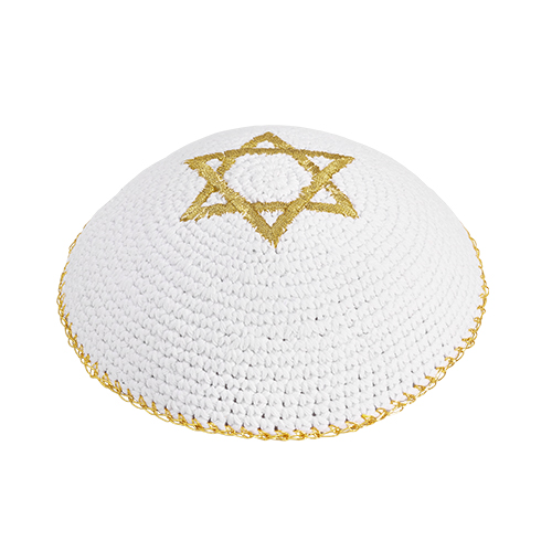 כיפה סרוגה 16 ס"מ לבן 6 מגיני דוד זהב