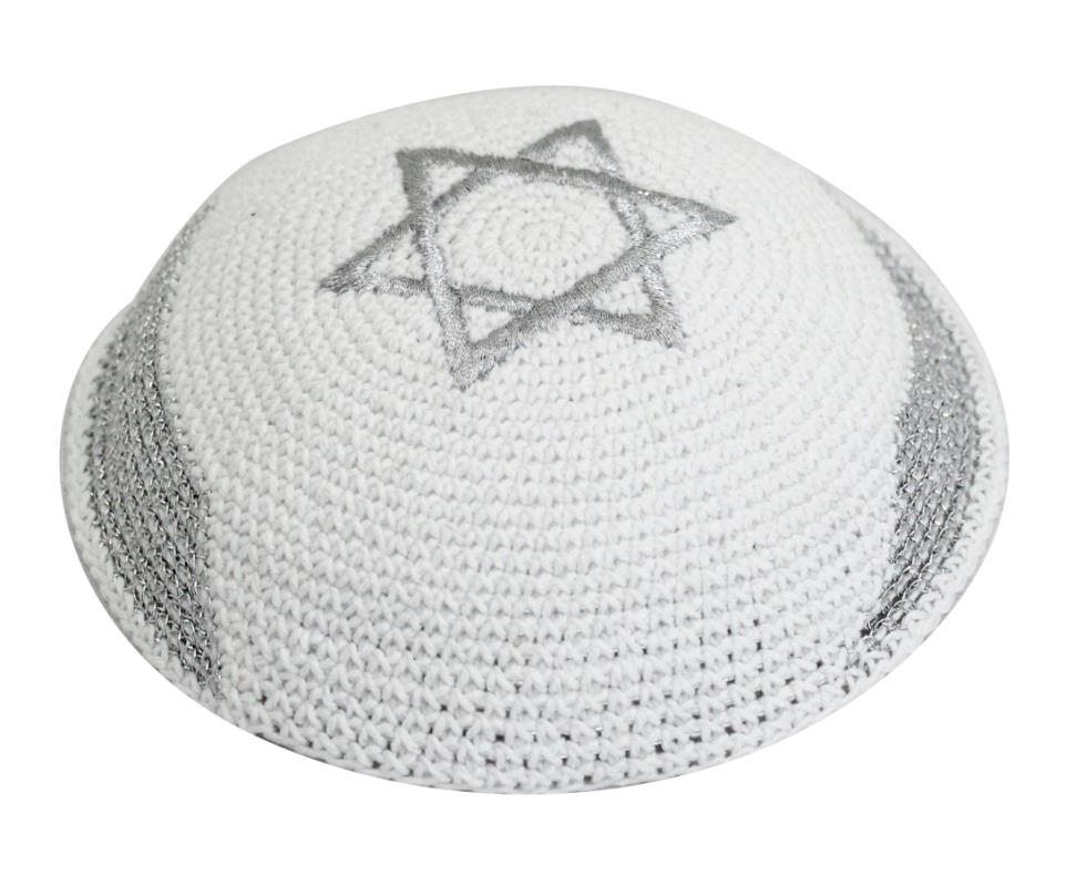 כיפה סרוגה 16 ס"מ לבן 6 מגיני דוד כסף