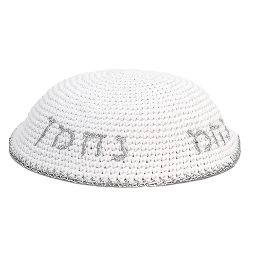 כיפה סרוגה 16 ס"מ לבן עם ריקמה "שמע ישראל" כסף