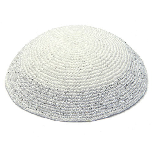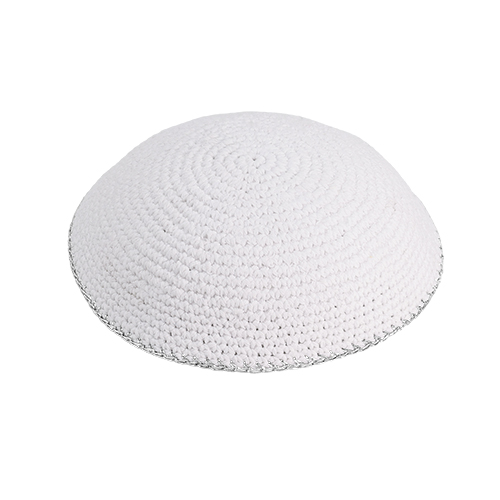 כיפה לבנה סרוגה 17 ס"מ חוט עבה פס כסף