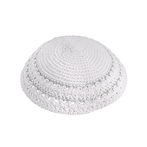 כיפה סרוגה 15 ס"מ לבן חוט עבה עם פס כסף