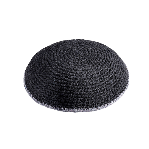 כיפה סרוגה 15 ס"מ שחור מסביב פס אפור