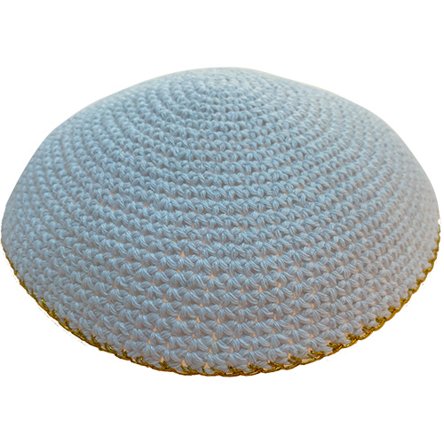 כיפה סרוגה 15 ס"מ לבן מסביב פס זהב
