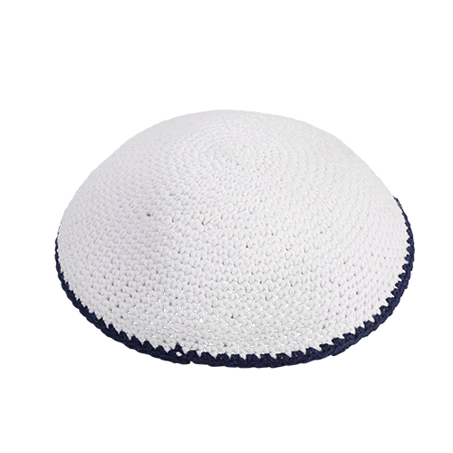 כיפה סרוגה 15 ס"מ לבן מסביב פס כחול