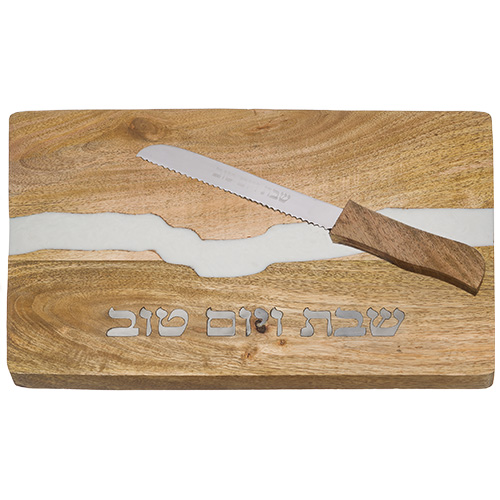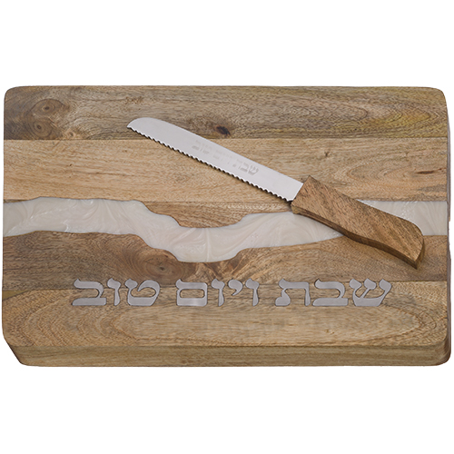 מגש חלה עץ עם אפוקסי לבן וסכין 41×28 ס"מ