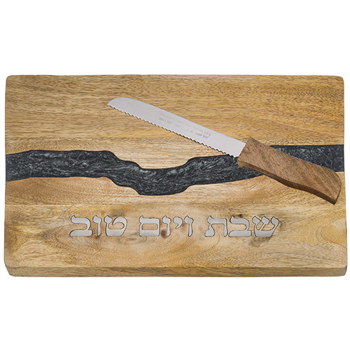 מגש חלה עץ עם אפוקסי אפור וסכין 41×28 ס"מ