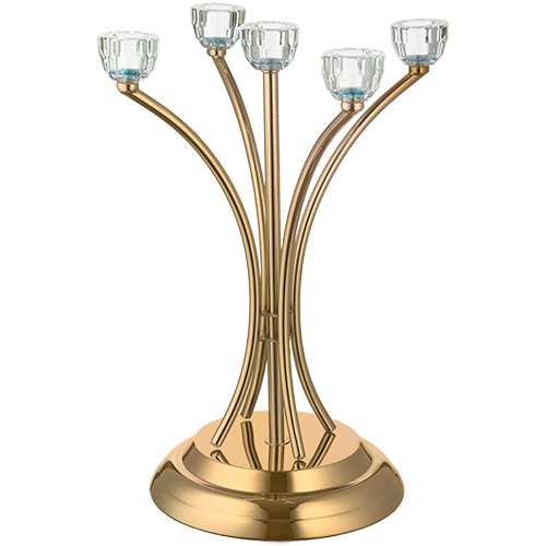 פמוט מתכת 5 קנים עם ראשי קריסטל גימור זהב 35 ס"מ