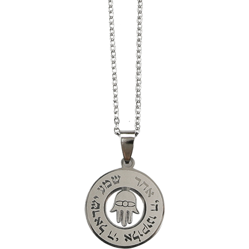 שרשרת פלדת אל חלד 50 ס"מ עיגול "שמע ישראל" עם חמסה בצבע כסף 3 ס"מ
