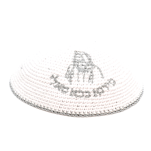 כיפה סרוגה 16 ס"מ לבנה עם ריקמה "בבא סאלי" כסף