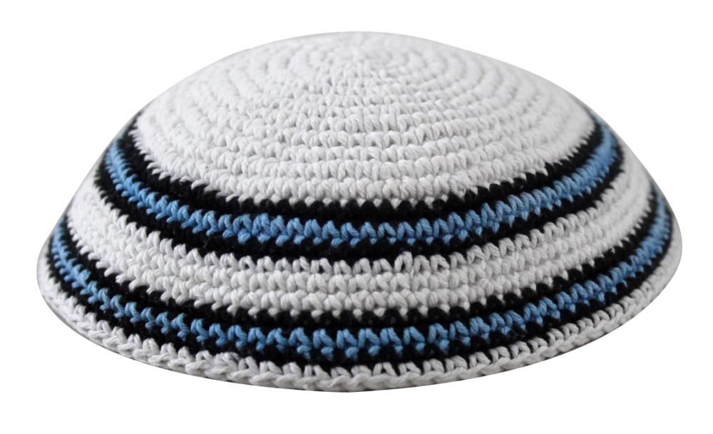 כיפה סרוגה 16 ס"מ לבנה מסביב שני פסים שחור ותכלת