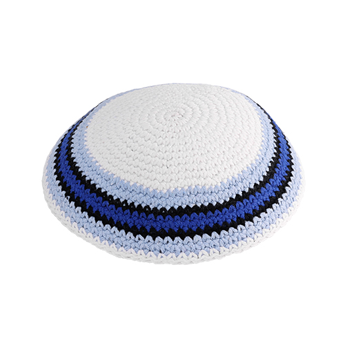 כיפה סרוגה 15 ס"מ לבן מסביב פס כחול