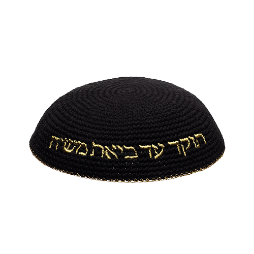 כיפה סרוגה 16 ס"מ שחורה עם ריקמה "נחמן מאומן" זהב